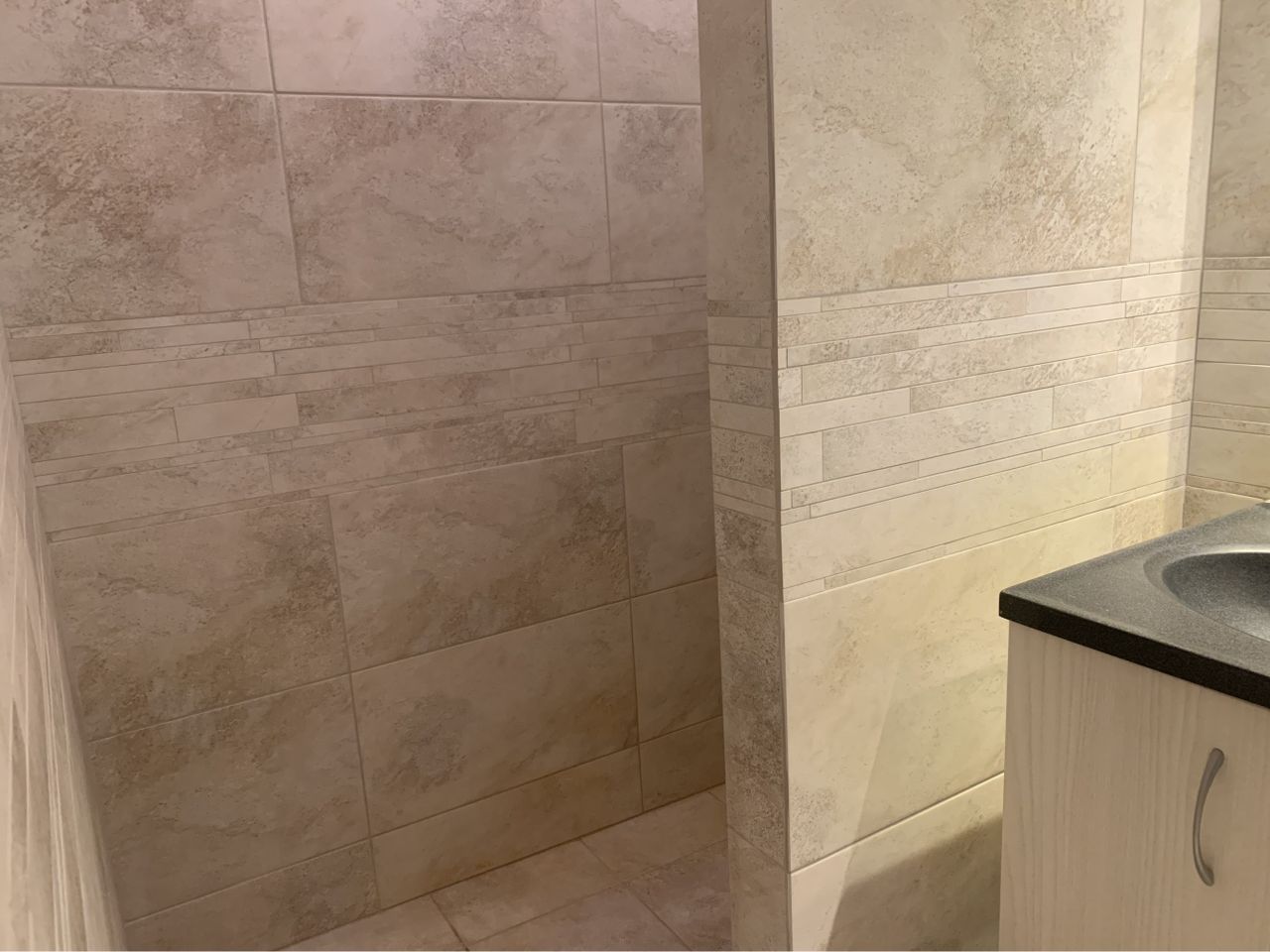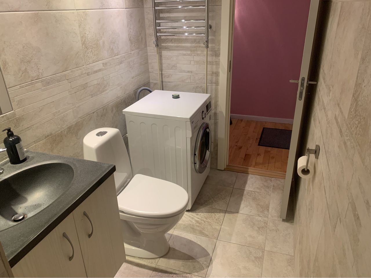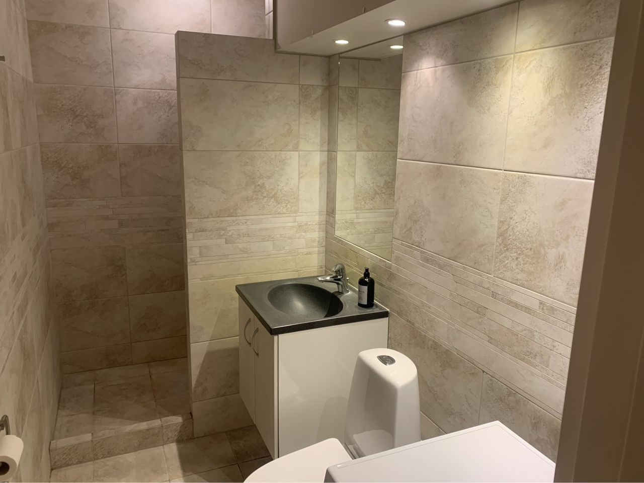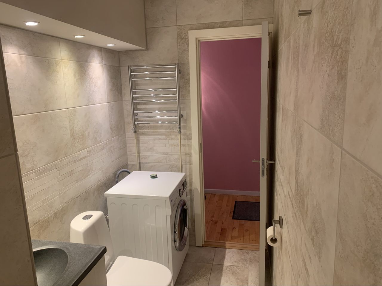 badeværelse med pæne fliser, bruseniche, gulvvarme, håndklædetørrer og vaskemaskine (De