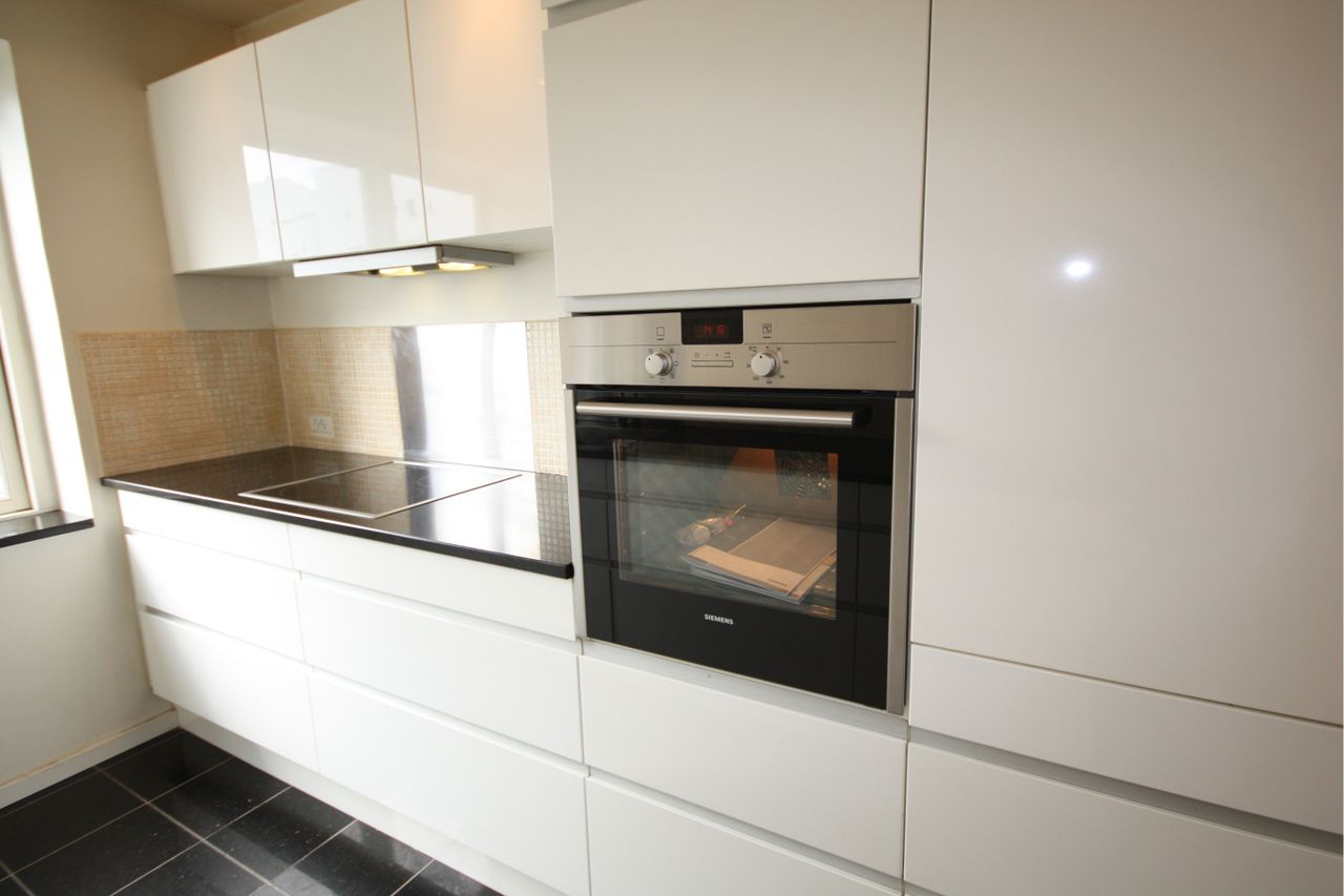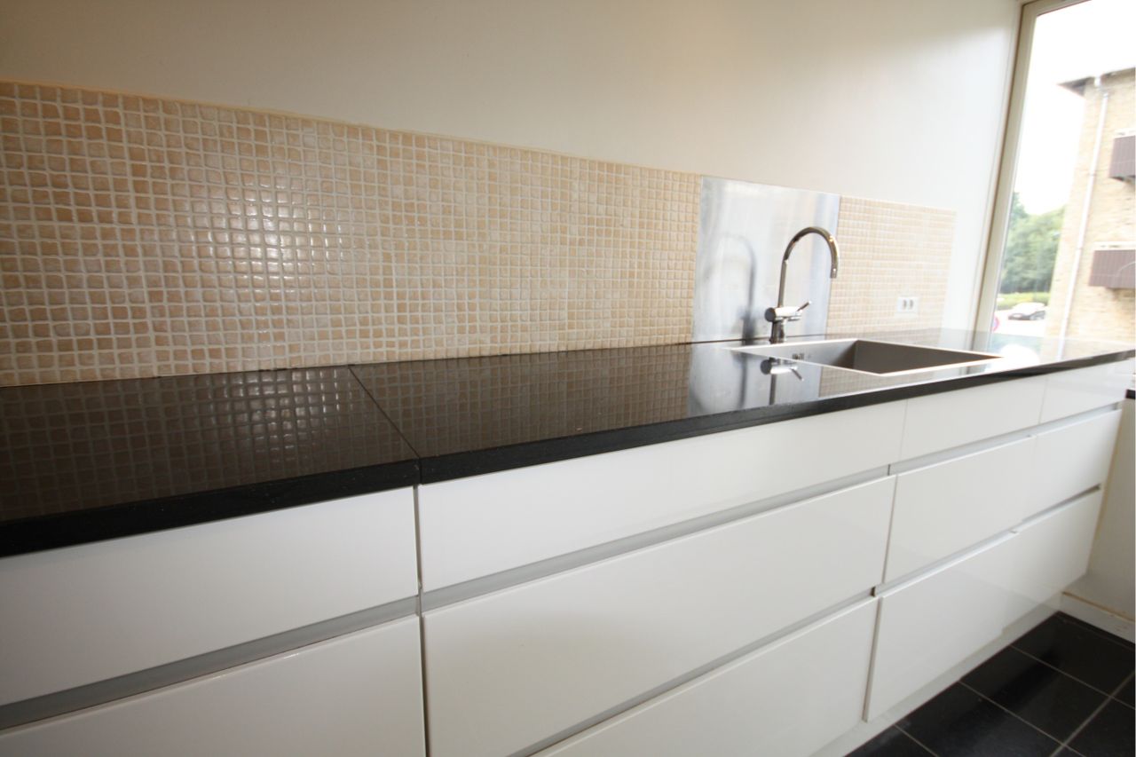 Køkken med sorte granit fliser og gulvvarme, hvide køkkenelementer, sorte granit bordplader og indbyggede hårde hvidevarer og spot i loftet.